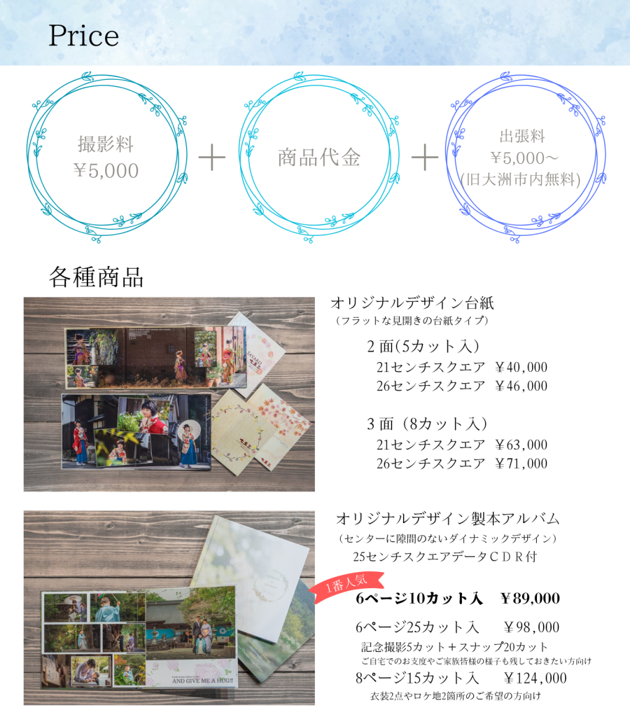 ロケーション撮影・データ付きアルバム・前撮り時のお支度代や、