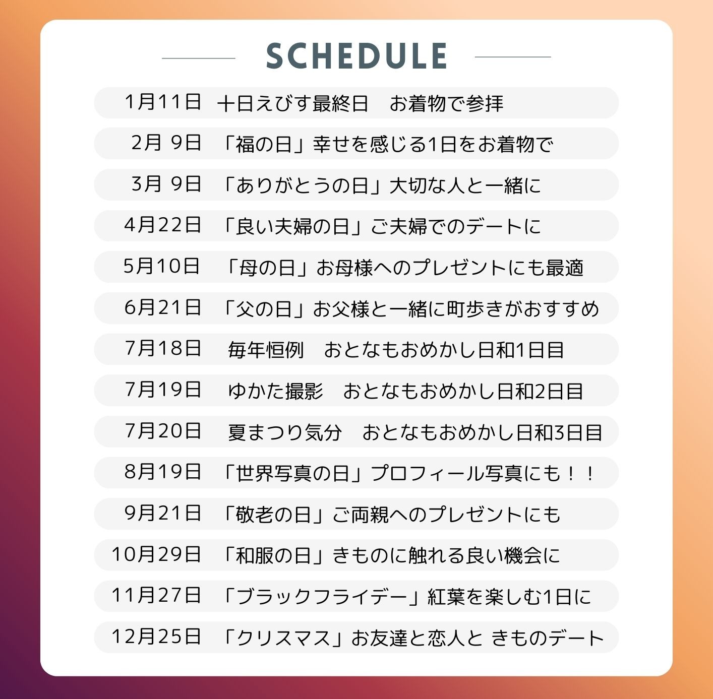 毎月1回、「母の日」や「和服の日」、「クリスマス」など季節のイベントに合わせた特別な撮影日をご用意しています。